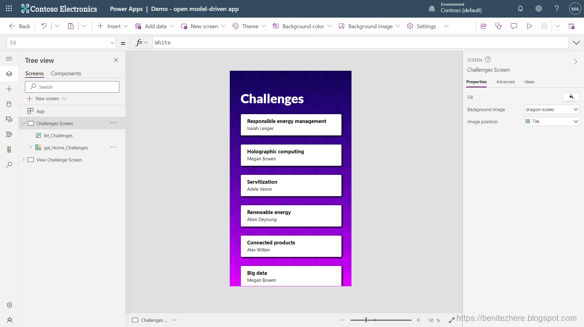 To keep it simple for this episode, I’m using two screens and the design is very basic. The first screen is a gallery that displays all active challenges from Dataverse.